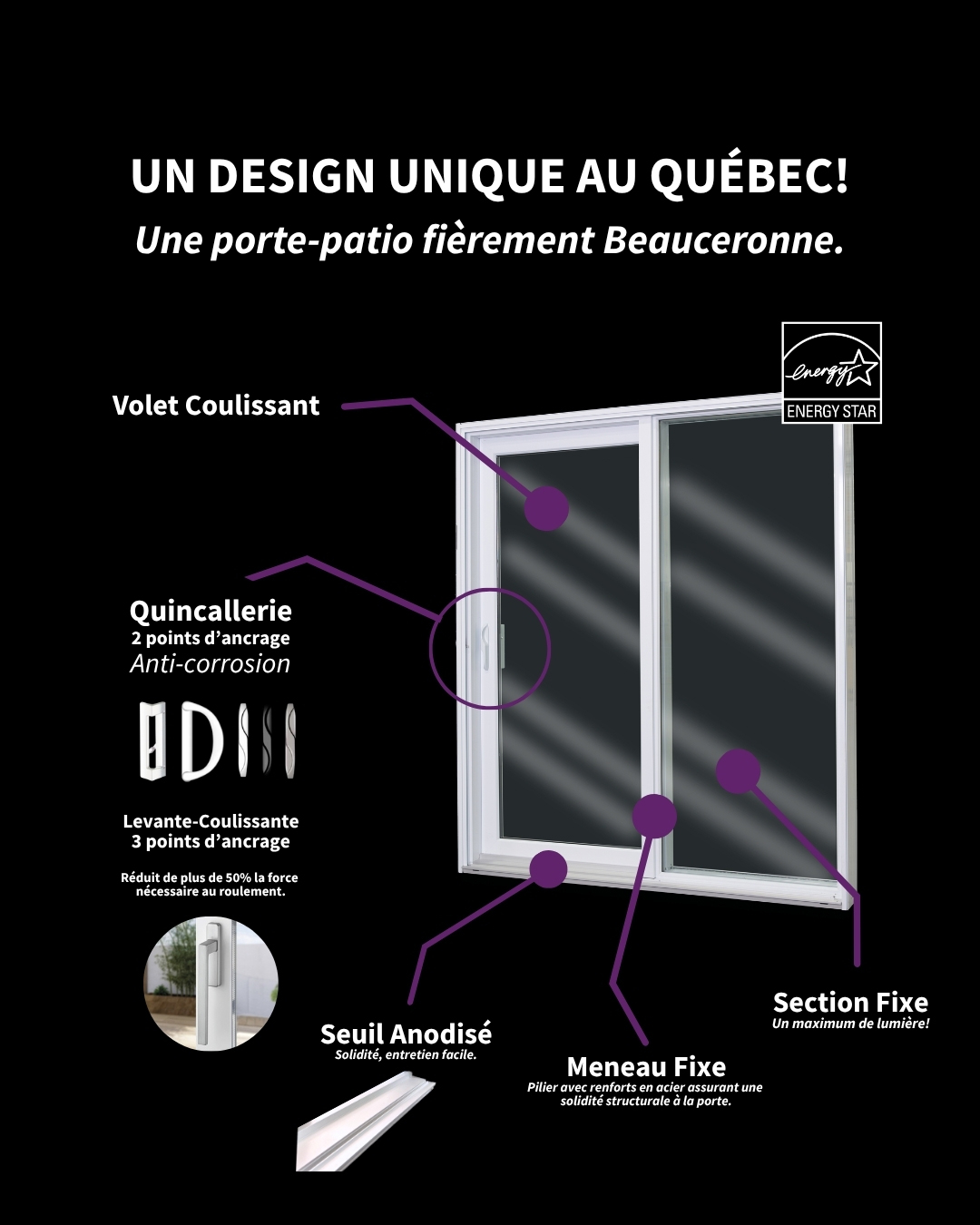 Système de meneau renforci d’acier! Cet atout est unique au Québec ! Le meneau renforcit la structure de la porte-patio et réduit le besoin d’équerrage à l’installation. Livrée au niveau !