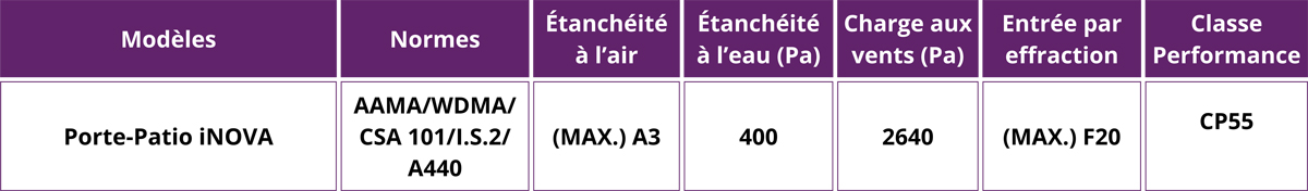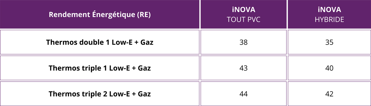 La Porte patio Inova rencontre les critères ENERGY STAR® Canada et atteint des rendements énergétiques (RE) de 38 en double verre standard, tout PVC. Peut atteindre jusqu’à RE 44 en tout pvc et RE 42 en hybride